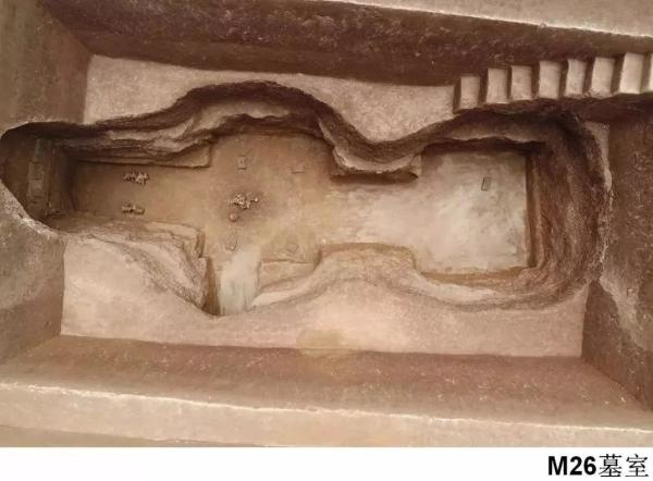 M26在距M25以西32米处,为长斜坡墓道前后室土洞墓。坐北朝南,自南向北依次由墓道、第一甬道、前室、侧室、第二甬道、后室组成。出土文物骑马俑、九盘连枝灯、陶罐、帐座、铁镜等12件。