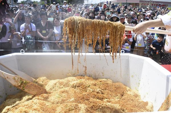 活动主办方在现场提供了包括巨型酱汁味炒面在内的三种口味样品供参与者品尝。和朋友一同参加的前桥市高中1年级学生黑泽天翔(15岁)说:“为了吉尼斯纪录而来。酱汁的味道满口留香。