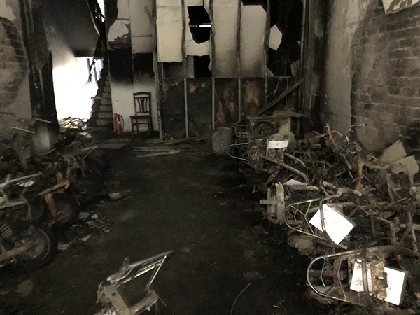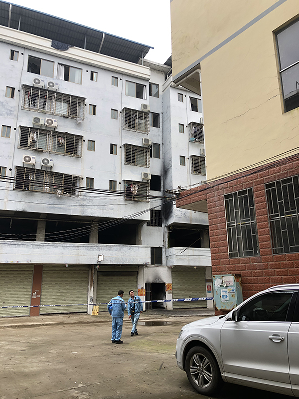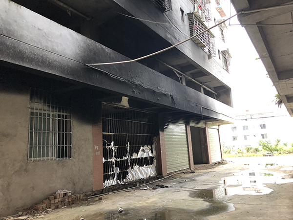 近距离观察可发现,在房屋的一楼内部,靠墙的两侧摆放着约20辆电动车,都被烧得只剩下铁架;一楼整个房间都被熏黑,往楼上走的楼梯较为狭窄。一位事发后曾进入该楼房的人士透露说,2楼内部也有地方被熏黑,但3楼以上没受到太大影响。