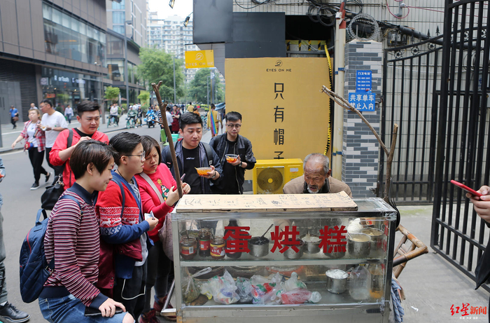 “这个大爷我在网上看到过!你看,他就是网上很火的那个蛋烘糕爷爷……”红星新闻记者在现场观察发现,除了排队购买的市民外,过往的市民看到这家店时都会议论几句。