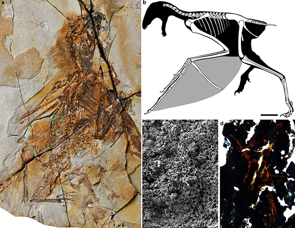 图2. a, 长臂浑元龙正型标本;b, 骨骼复原图;c. 膜质翼膜色素体;d. 骨质胃容物组织切片. bn, 骨质胃容物; gs, 胃石; mw, 膜质翼膜; st, 棒状长骨(王敏供图)