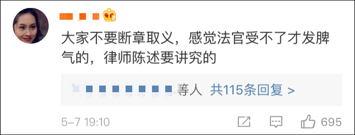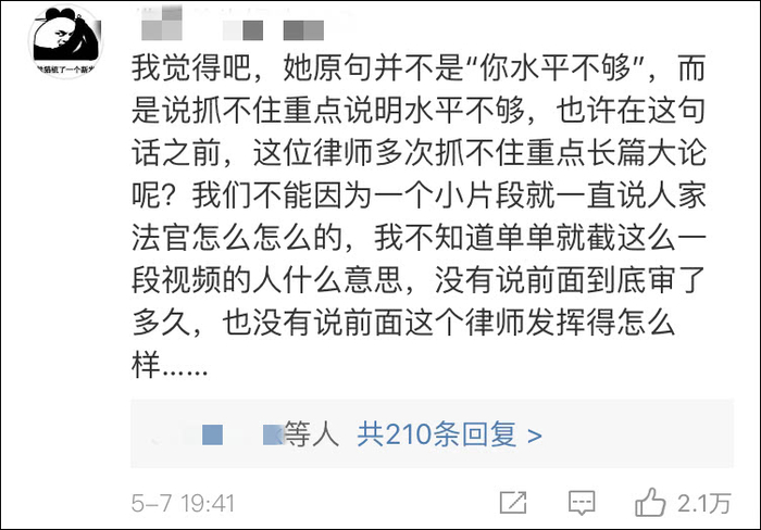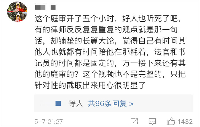 还有一些支持罗法官的网友不满道,如果审了5个小时之久,律师一直都是这副语气,庭审效率势必也会受到影响……