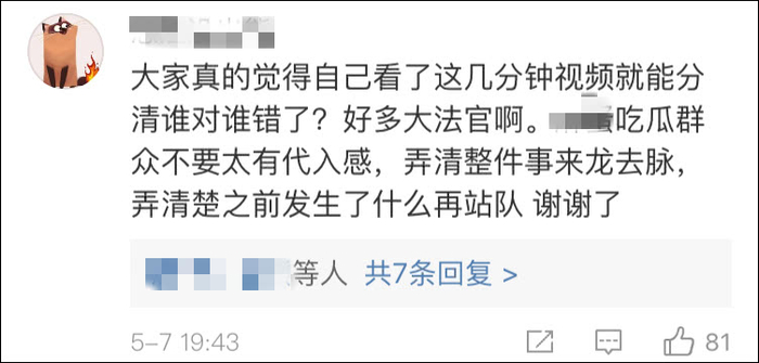 其他理性的人则认为,不应该在信息量过少的情况下指责任何一方,还是应该等把来龙去脉都弄清楚后,再评判不迟。