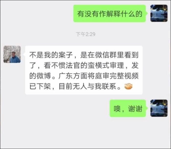 为了还原事件细节,北京时间于5月8日,就此采访了最早发布微博的张庭源律师。不过,后者澄清这不是自己的案子,只是在微信群看到的,他不满法官的“蛮横式审理”。