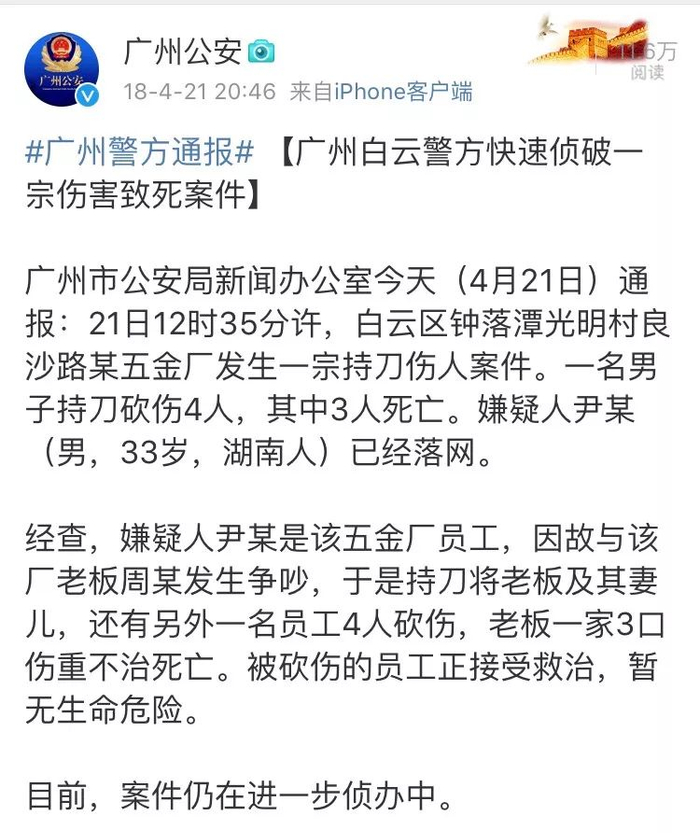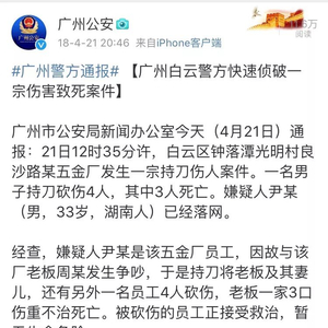 2018年4月21日12时35分许,广州白云区发生一宗持刀伤人案件,在钟落潭光明村良沙路某五金厂,一名男子尹某持刀砍伤4人,其中3人死亡,尹某(男,33岁,湖南人)被公安机关当场抓获。