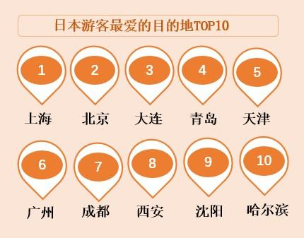 日本游客最爱的十大热门目的地依次为上海、北京、大连、青岛、天津、广州、成都、西安、沈阳、哈尔滨,一线城市仍然保持较高的旅游热度。
