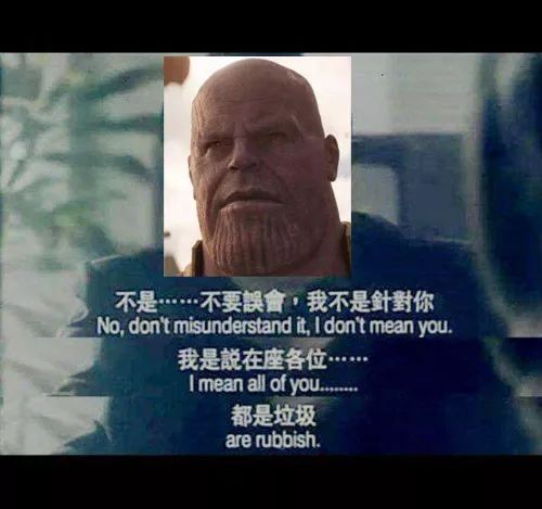 唐僧:哎呀灭霸你也真调皮呀!我叫你不要乱扔东西嘛!乱扔东西是不对的……你看我话还没说完你怎么把无限手套也扔掉了?无限手套是宝物,乱扔会污染环境的,砸到了小朋友怎么办?就算砸不到小朋友砸到花花草草也不好嘛……善了个哉的,你还敢瞪我?八戒,悟净,上!帮你们大师哥一起削他!