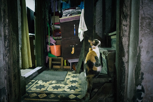 弄堂里的猫在凝望昏暗狭窄的楼梯尽头。