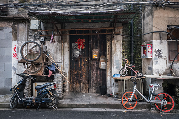 大门紧闭的老城厢民居,翻斗车、电瓶车、童车和共享单车四代同堂般排列在门口。