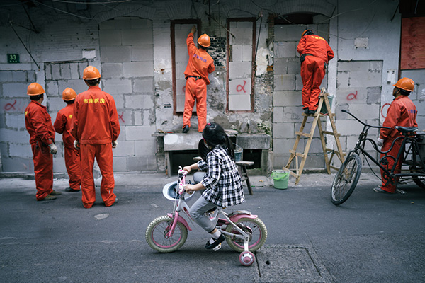 学骑车的小女孩看到拆房队的工人在封门。