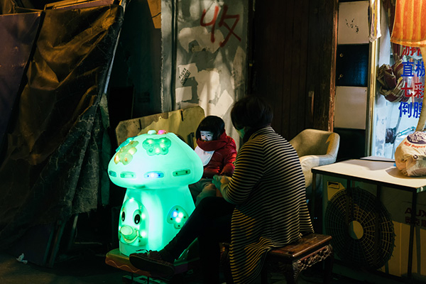 冬夜里,外婆陪外甥女坐摇摇车。