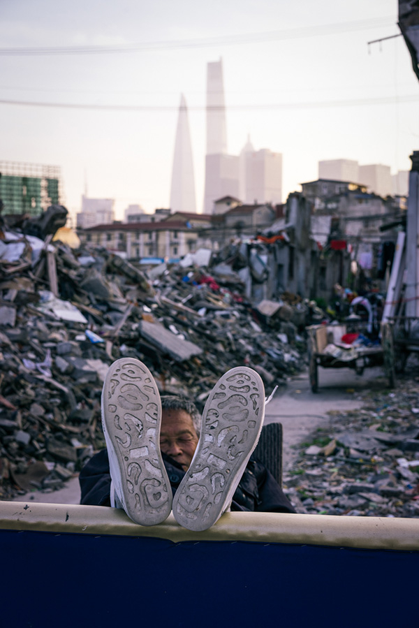 杨树浦路,一位暂住在废墟里的大爷晒着太阳。