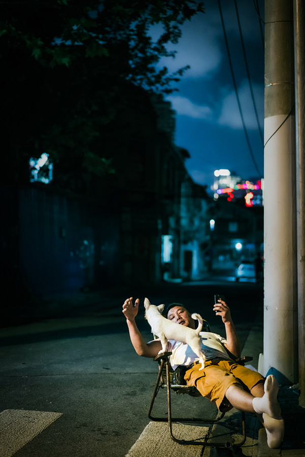 夏夜里,翁家弄弄堂口的大叔在乘凉时逗自家的小狗。