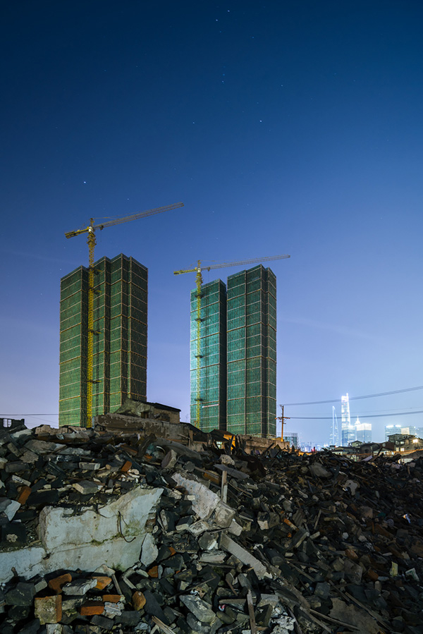 高层小区在八埭头的废墟里拔地而起,远处是陆家嘴的摩天大楼。