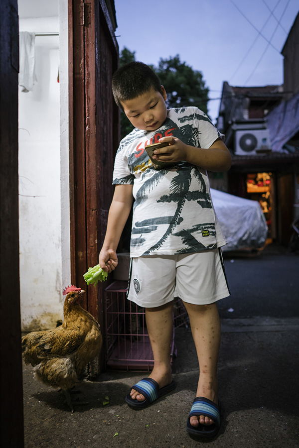 晚饭后,弄堂里的小胖墩一边玩手机,一边用青菜喂家里养的鸡。