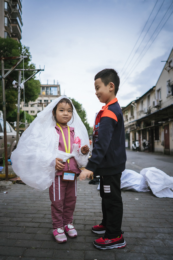 住在松雪街的快递兄妹,将当天搬家时整理出的塑料布戴在头上当婚纱。夜里,他们家的快递收寄点也搬至附近的老城厢。