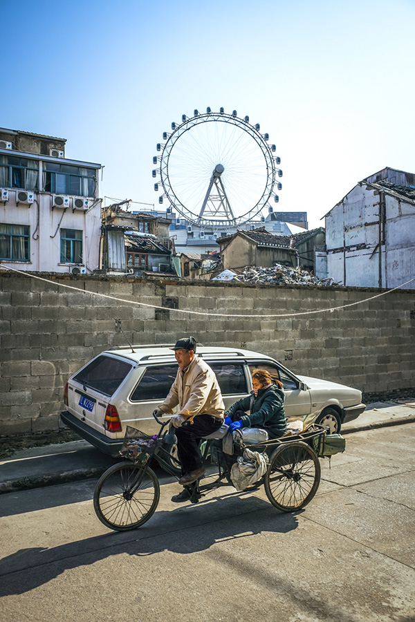 静安区大悦城对面的拆迁地。一对外来务工夫妇骑着三轮车,经过静安区地标摩天轮。本文图片均由施佳宇拍摄,周平浪编选。