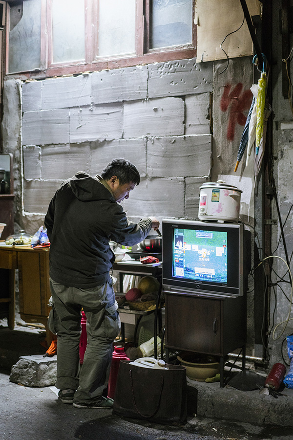 金家坊弄堂口的一家喜欢在弄堂里聊天、看电视、吃晚饭,大叔在炒菜时看弈棋耍大牌。