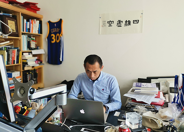 推开国家天文台研究员、中科院大学天文学教授苟利军的办公室,一个不大的空间里堆满了书籍,书桌后一幅“四维虚空”的书法古拙又有趣,书桌的正面对是一块写满密密麻麻公式的大白板。