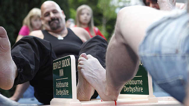 扳手腕大赛见多了,扳脚腕大赛你见过吗?在英国就有一项“国际锦标赛”,而且已经举办了43年。