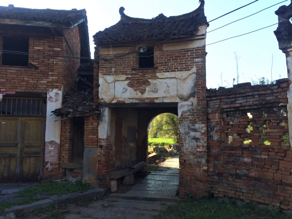 进入村子,先是看到是一座城门,虽是复建,也可领略到当年的防御工事。村子里保存有不少明清时期的砖房建筑,房屋飞檐翘角,雕梁画栋,外形与徽派建筑有些相似,都有着高大的马头墙。不过徽州民居是白墙黛瓦,而这里是红砖青瓦,色调更明亮些。