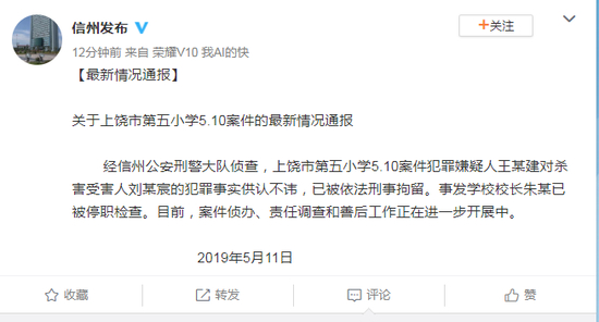 经信州公安刑警大队侦查,上饶市第五小学5.10案件犯罪嫌疑人王某建对杀害受害人刘某宸的犯罪事实供认不讳,已被依法刑事拘留。事发学校校长朱某已被停职检查。目前,案件侦办、责任调查和善后工作正在进一步开展中。