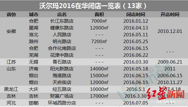 红星新闻了解到,2015年沃尔玛在中国仅关闭1家门店。而从2016开始,沃尔玛在中国关闭门店的数量开始明显增多,全年总共关闭13家门店,其中安徽6家,山东3家,江苏、黑龙江、吉林、河北各1家。