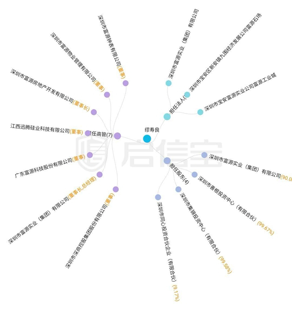 启信宝的数据显示,缪寿良同时是深圳市富源实业(集团)有限公司的法定代表人和大股东。此外,缪寿良的关联企业中有9家仍存续,其中包括一家新三板上市企业。