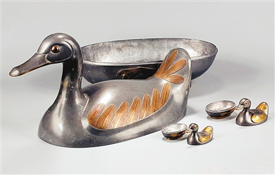 子母鸭。这件制作于民国时期的子母鸭盖盒,以锡为材质,其上镶铜。共有一大两小三只鸭子,大的是母鸭,它长36.5厘米,宽21.7厘米,高26.8厘米;小的是鸭仔,它们长7.8厘米,宽3.7厘米,高6.9厘米。盖盒为鸭子造型,从中间可以分开,内部中空,鸭子的眼睛、羽毛和尾巴以及双腿都使用铜镶嵌工艺,使得三只鸭子栩栩如生,灵动鲜活,充满动人的情趣,使人见而心喜。 (谢丽成)