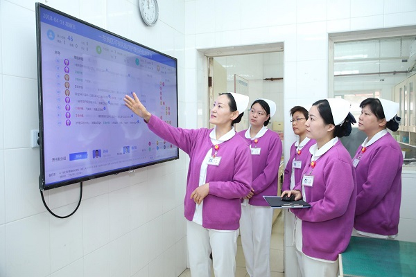 图说:大华医院护理部主任杨雅(左一)参与开发“可视化护理综合信息平台”,为护士工作“减负” 采访对象供图