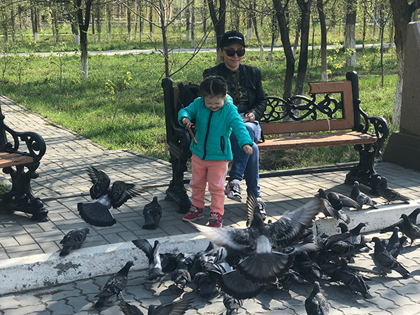 阿特劳市景一瞥,一位小童正在忘我地喂鸽子