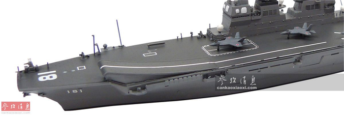 尽管日本官方在极力淡化出云级直升机航母的潜在进攻性用途,称其只会用于反潜和夺岛作战,但敏锐的日本模型厂商在推销模型时并未避讳这点,甚至连出云级改装后增加的滑跃飞行甲板都已表现出来,注意滑跃甲板的位置类似英国无敌级,无需移除舰艏的“密集阵”近防炮,还能看到甲板上的2架F-35B模型,但图中的舷号181(实为“日向”号)标注错误,应为183或184。