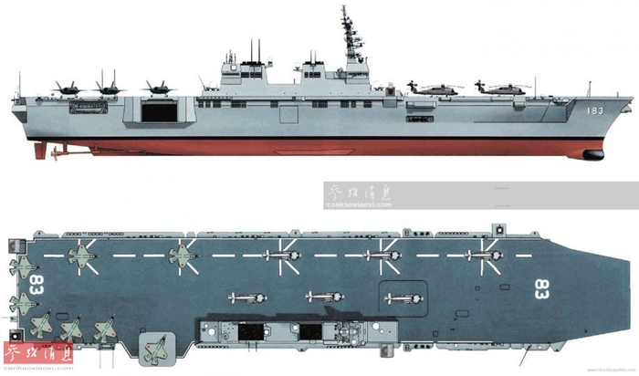 出云级的开发代号称为22DDH(平成22年,即2010年,DDH:直升机驱逐舰缩写),实为日向级直升机航母的放大版,与后者相比,增强了两栖运输能力。出云级共建2艘(“出云”号及“加贺”号),每艘全长248米,全宽38米,吃水7.5米,满载排水量2.7万吨,最大航速大于30节。每艘最多可搭载28架舰载机。图为出云级直升机航母两视图,除直升机外,在舰艉甲板可见F-35B短垂战机。