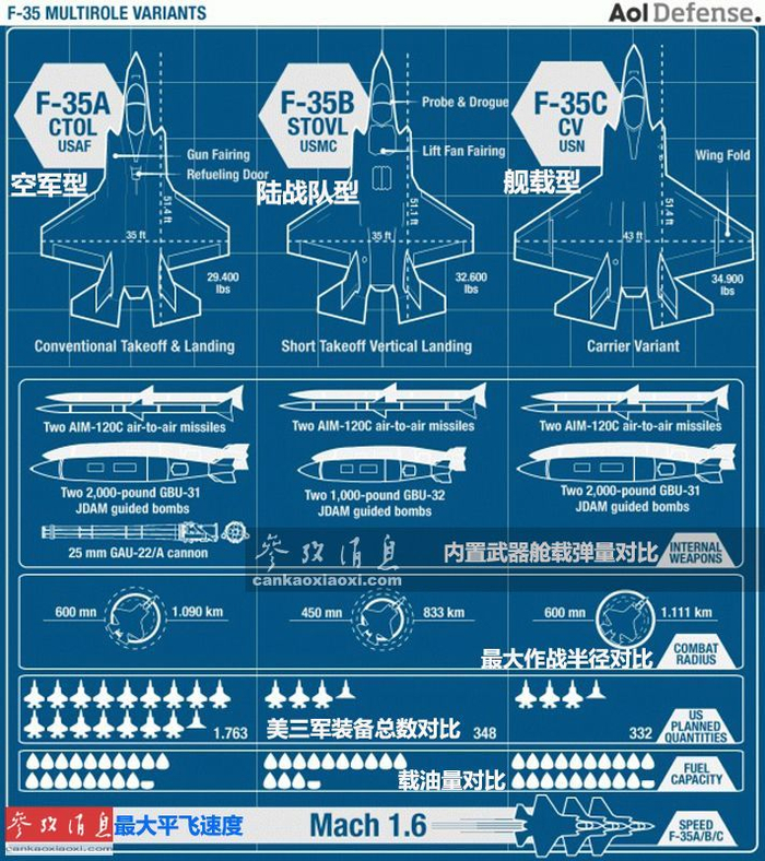 这张对比图详细列举了F-35系列三型号的作战性能,其中F-35A(空军型)是唯一配备固定航炮的型号,F-35B则是三型中唯一具备短垂起降能力的,而F-35C(海军舰载型)是三种型号中尺寸最大的,其作战半径也是三型中最大的,三种型号的最大平飞速度均为1.6马赫。