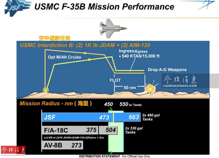 从洛马公司官方公开的F-35B作战性能看(如图所示),单架F-35B在执行空中遮断任务,携带2枚454千克级JDAM卫星制导炸弹和2枚AIM-120空空导弹(只使用内置弹舱)时,最大作战半径可达876千米,要远超采用同等载弹量的AV-8B和F-18C战机。