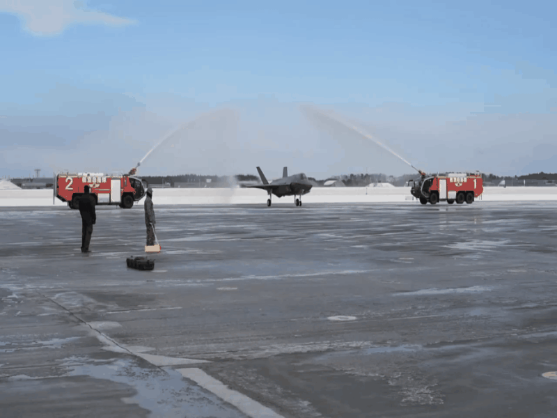 2018年1月28日,日本三泽基地部署首架F-35A庆祝仪式动态图,可见F-35A穿越水门。