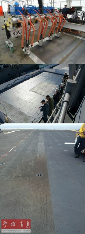 最直接的解决方案是直接在甲板上铺设“热喷涂防滑涂层”,经试验测试,能大幅缓解F-35B尾喷管在起降阶段对飞行甲板的烧蚀现象。图为美海军使用专用设备在甲板上铺设“热喷涂防滑涂层”资料图。