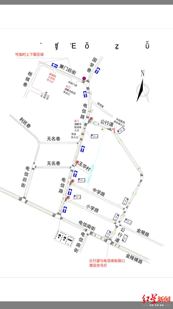 电信路、国学巷实施机动车由南向北单向交通组织。