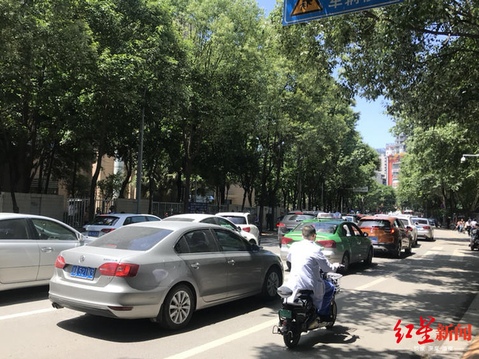 5月13日下午1点过,城区道路安静了下来,车流减少,当红星新闻记者来到四川大学华西医院时,周边道路却排起了长队。从黉门后街的停车场入口起,一直延伸到电信路,三条单向通行的机动车道上被排队进入停车场的车辆占据了两条。导致其他通过性车辆不得不在队伍中缓慢通行。