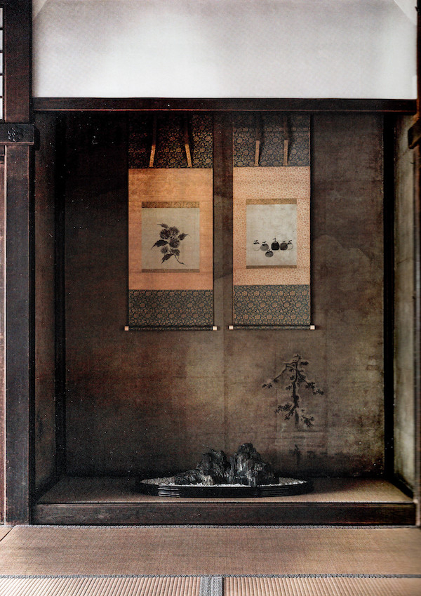 《六柿图》在留有大片空白的纸上,仅仅画了六个错落分布的柿子,其形状大小、用墨浓淡都不相同,这就把柿子的前后空间关系和成熟的程度表现了出来。牧溪这种“知白守黑”“计白当黑”的创作思维,给观看者留下许多想象的空间。这幅静物画,以非常简省、质朴,充满拙意的技巧,反映出了一种安稳致远、万物有常、淡泊名利的禅意。《六柿图》与《栗图》是从手卷上切割下来的,其本来的形制和状况与两岸故宫收藏的《写生图》卷最为相似,目前以倭裱的形制装潢,充当龙光院茶室的挂饰。