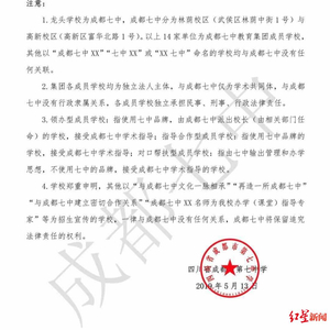 公告指出,集团龙头学校为成都七中,包括林荫校区(武侯区林荫中街1号)与高新校区(高新区富华北路1号),除了名单公布的14家单位均为集团成员学校意以外,其余的以“成都七中XX”“七中XX”或“XX七中”命名的学校均与成都七中没有任何关联。