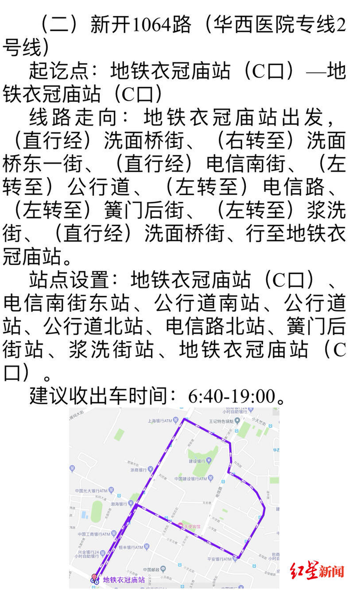 最后,从起点华西坝B口出发沿着华西医院片区站点经停,行驶一圈回到华西坝B口,大约耗时15分钟,十分快速。据了解,这三条公交专线将于5月16日正式启用。