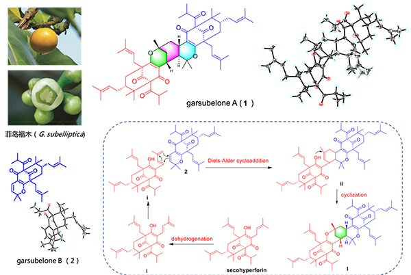 其中博士研究生汪永玲在藤黄属代表性物种菲岛福木(Garcinia subelliptica)的研究中,通过HPLC-MS发现了MS>900的分子离子峰的存在,并经由一系列分离纯化手段成功纯化得到化合物garsubelone A。然而,该化合物谱图信号的重叠、缺失等因素对其结构确证带来了巨大的挑战,最终研究组凭借多年积累的经验,确定garsubelone A为具有6/6/6/6/6/6/6七环复杂骨架的PPAP二聚体,并由X射线单晶衍射确定了其绝对构型。生源上该化合物应该是由garsubelone B的C-3位的异戊烯基末端脱氢形成共轭双烯后,与secohyperforin通过Diels-Alder环加成反应以及进一步环化形成。上述研究成果以Garsubelone A, the First Dimeric Polycyclic Polyprenylated Acylphloroglucinols with Complicated Heptacyclic Architecture from Garcinia subelliptica 为题发表在Organic Letters (DOI: 10.1021/acs.orglett.9b00388)。系首个天然PPAP二聚体的研究报道。