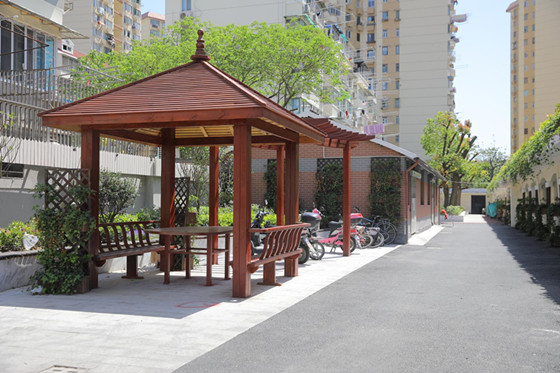 在进一步完善小区设施功能的同时,新北小区还补足了环境的短板。区房管局工作人员介绍道,以前小区的绿植多以麦冬为主,不仅谈不上美观,而且一到夏天就成为苍蝇蚊子的天堂,令居住在低层的居民们苦不堪言。部分居民还在天井内、房屋外侧私搭乱建,生活污水随意排进小区绿地,臭不可闻。区房管局联合江湾镇街道,集中整治了小区内的违章搭建,统一更新“防盗窗、雨棚、晾衣架、空调机罩、电缆线罩”5件套,12幢房屋全部“洗脸换装”,改变老旧小区给人的“脏乱差”印象。同时,邀请专业绿化工作人员,通过修剪移栽树木、替换和增加绿植种类、在屋顶实施垂直绿化、新建休憩凉亭和健身步道等方法,让小区环境焕然一新。“以后在小区里就能散步、锻炼身体,不用特意跑到公园去了!”今年78岁的武秉谦高兴地说。