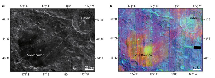 研究人员在论文中还提出,这些物质来源于探测点附近的芬森撞击坑(Finsen impact crater)撞击事件。芬森坑撞击事件进一步将南极-艾托肯盆地更深部物质挖掘出,产生的溅射物四处抛射,呈辐射线撒布在冯•卡门撞击坑“平原”上。