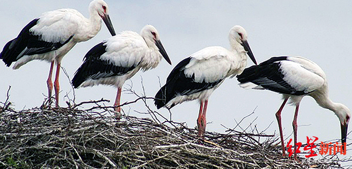 据介绍,每年春天,这一带都会有东方白鹳飞来,在此交配繁衍并孵化雏鸟,每对鹳鸟通常会产下两到五枚蛋。东方白鹳的雄鸟会与雌鸟共同孵蛋,白天通常由“爸爸”孵蛋,夜晚则换“妈妈”轮班。