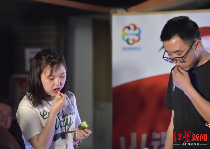 主持人宣布,获胜者为与他“拼桌”的刘女士。虽然晚几秒举手,但刘女士却早几秒吞下了最后一个小米椒。