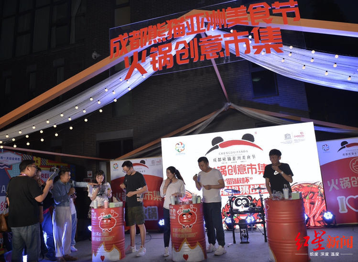 铁像寺水街景观大道上弥漫着一股浓浓的火锅味,一条几十米街道上密密匝匝挤满了人,除了来火锅创意市集体验成都火锅的吃货,还有专程来看辣王挑战赛的市民。
