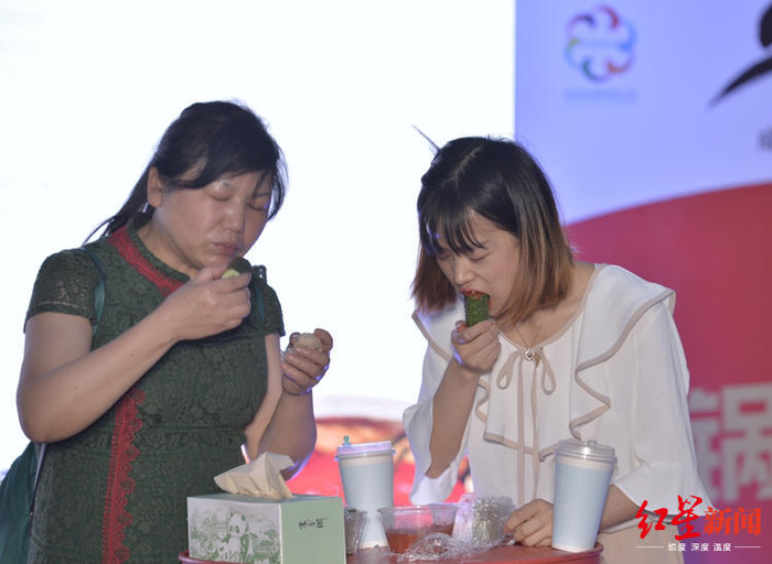而旁边一位挑战者还保留着最后的一丝倔强,充分践行了“手可抖,汗可流,辣椒不可留”的原则,即便是面红耳赤,吃黄瓜的频率越来越高,也不愿意像隔壁对手一般“牺牲”在辣椒台上。