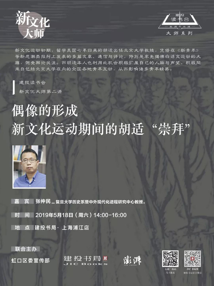 5月18日,我们邀请到复旦大学历史系暨中外现代化进程研究中心张仲民教授,为大家带来“偶像的形成:新文化运动期间的胡适‘崇拜’”这一专题演讲,通过追溯这位近代精英人物的言行事功,细看其格局与识见对近代中国的影响,带大家于历史脉络的探究中找寻历史的实际。